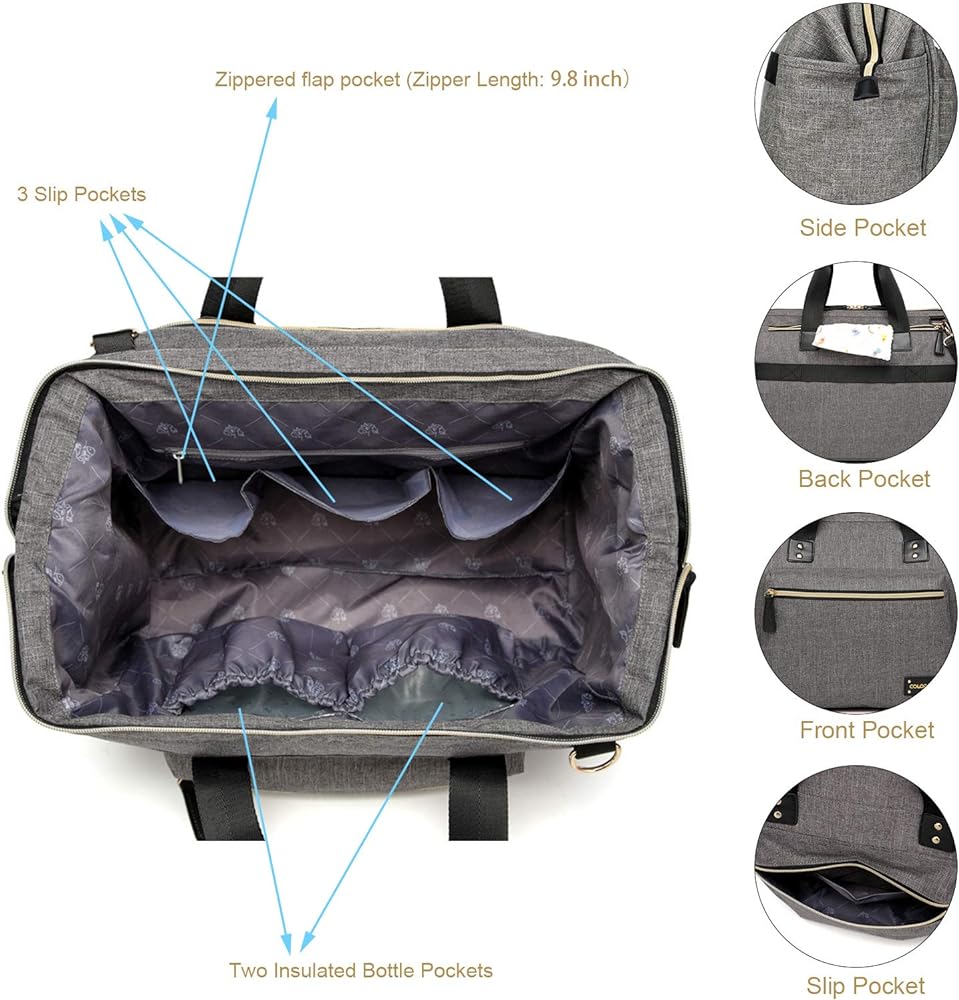 - الكثير من التخزين: 10 جيوب متعددة لمستلزمات الطفل حديث الولادة بما في ذلك 5 حجرات بالإضافة إلى جيبين معزولين للزجاجة مغلفين بورق القصدير.