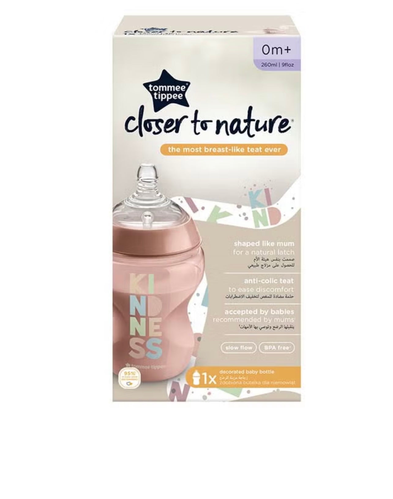 OverviewWith our award-winning Closer to Nature baby bottle, switching between breast and bottle feeding has never been simpler – in fact it has been voted as mum’s #1 bottle for switching between breast and bottle! With our breast-like teat and built-in anti-colic valve, it could just be the best thing for baby, since you! Inspired by mum, designed by experts. Loved by mums and babies, our easy latch-on, breast-like teat feels closer to skin and mimics the natural flex and movement of a mum’s breast for a comfortable feed. 95% of mums reported that their baby accepted the super soft silicone teat with skin-like feel and would recommend to others. All Closer to Nature bottle teats feature an anti-colic valve to prevent the symptoms of colic by ensuring your little one ingests more milk and less air. Together with the bottle’s sensitive valve, the wide bottle neck encourages your baby’s intuitive feeding action. Designed to be held in the most natural position during feeding, the compact shape of the bottle also allows baby to be closer to you. Tommee Tippee Closer to Nature baby bottles are available in a wide range of sizes, colours and decorations. Teats are available in a range of flow rates too, so the milk can flow faster as your baby gets hungrier! The wide neck bottle makes cleaning easy and the bottles are suitable for use in the dishwasher, microwave and steam sterilisers. 100% BPA-free for complete peace of mind. Which flow rate do I need? We offer different flow rates to keep up with your growing baby. Every baby is different but as a guide we suggest slow flow for 0+months, medium flow for 3+ months and fast flow for 6+ months. Closer to Nature teats are only compatible with Closer to Nature bottles.