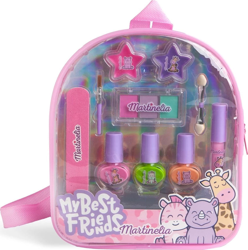 Martinelia My Best Friend Bag: an amazing backpack children's beauty bag that includes 1 eyeshadow palette in 3 colors, 3 water-soluble nail polishes, 3 lip glosses, 1 nail file, 1 lip gloss brush and 1 applicator.